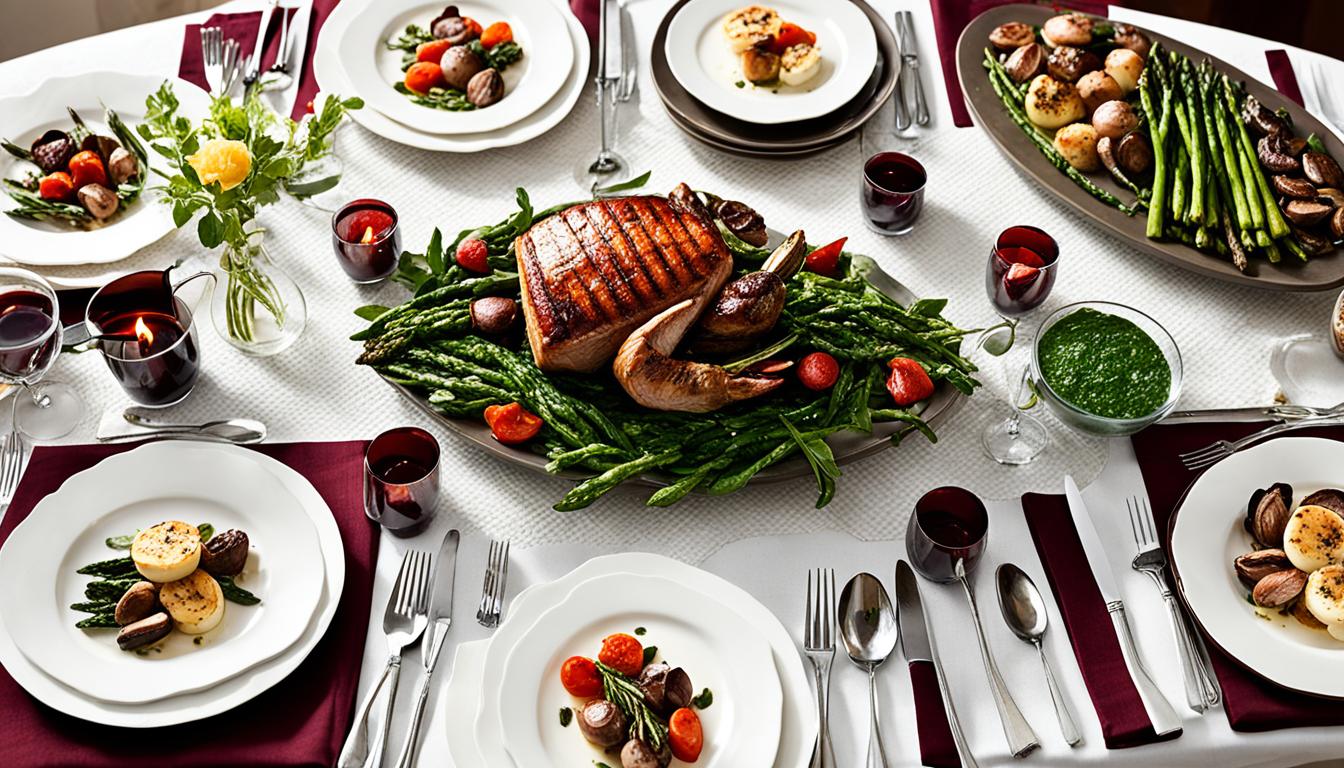 For a health-focused main course, try vegetarian recipes. Imagine a creamy risotto with seasonal veggies or a mushroom Wellington in golden pastry. These dishes are both tasty and healthy for your romantic dinner.